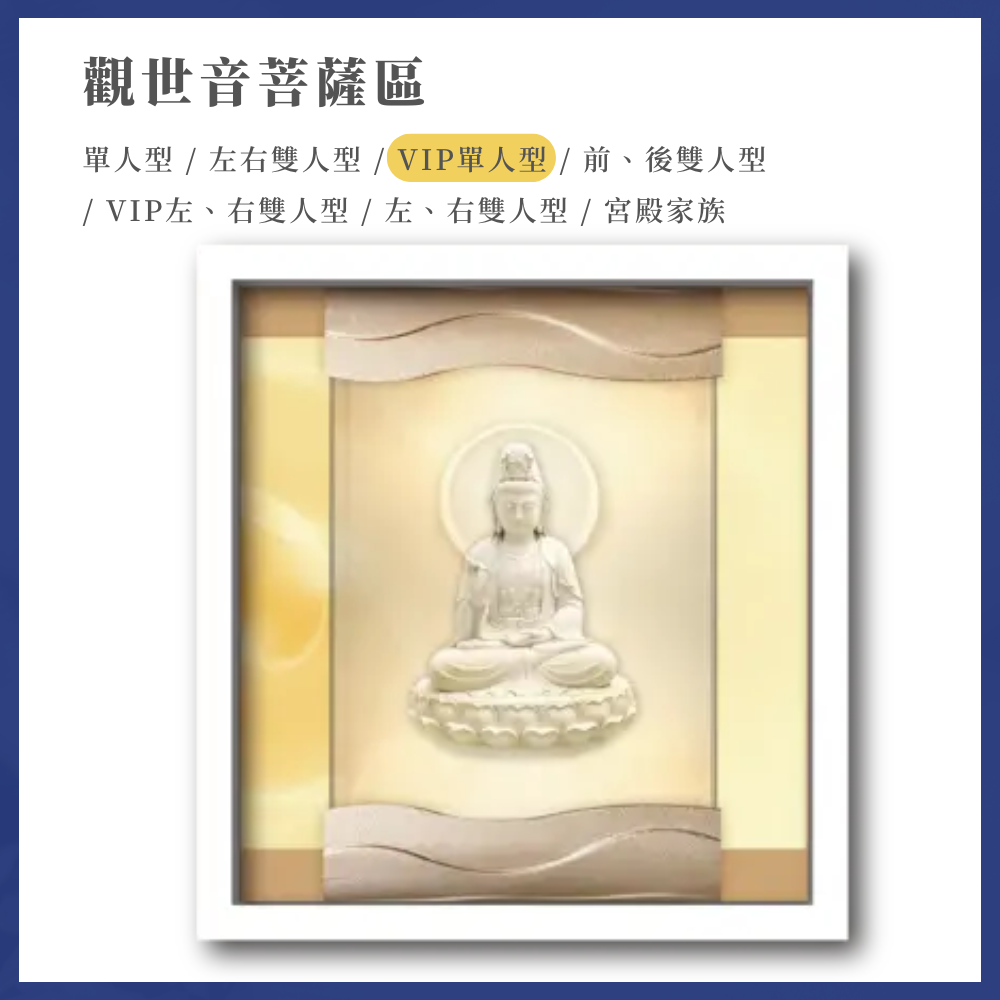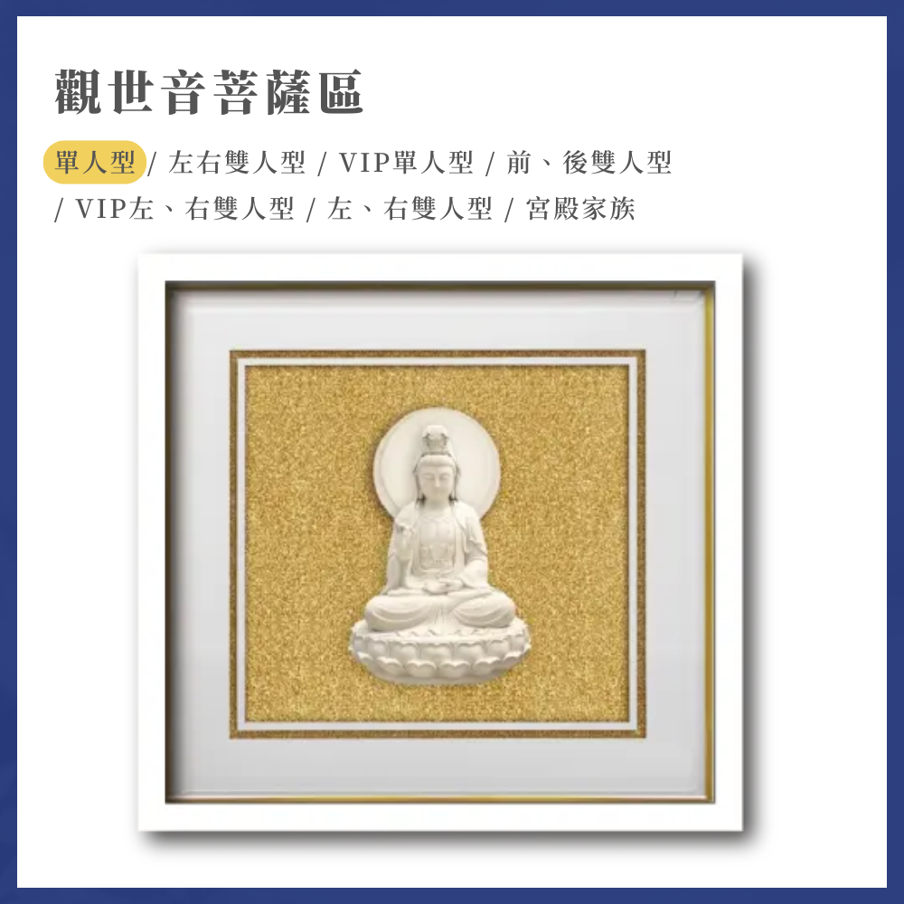 慈悲法相設計:主尊觀世音菩薩端坐蓮台,神情柔和莊嚴,象徵慈悲無量、普渡眾生。